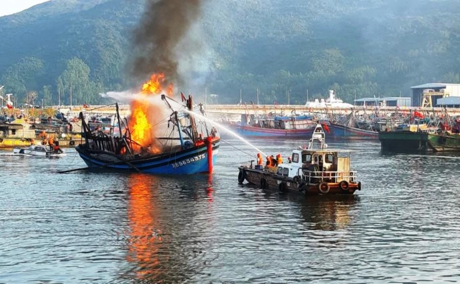 Lực lượng PCCC và CNCH Trên sông chữa cháy một tàu cá ở âu thuyền Thọ Quang. Ảnh: H.H