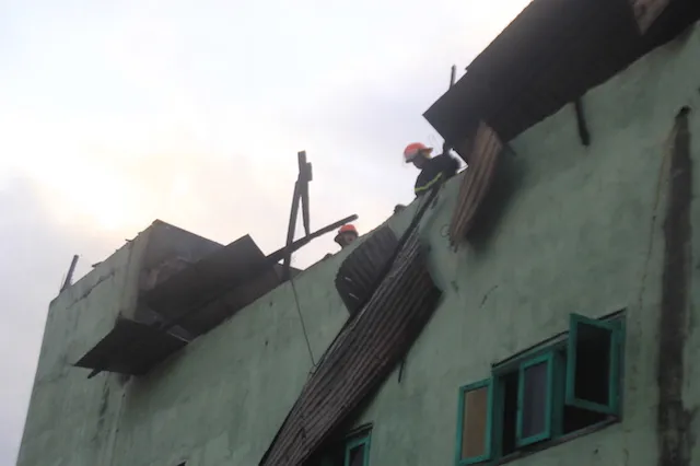 Lực lượng chức năng tháo gỡ ngói tôn để xịt nước cứu hỏa