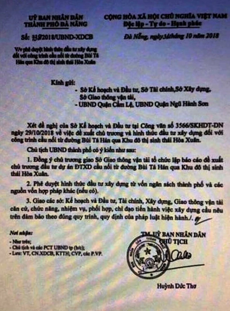 Trước đó, trên các trang mạng xã hội đăng tải Văn bản 738/2018/UBND-XDCB ngày 31-10-2018 giả mạo chủ tịch UBND TP Đà Nẵng ký với tiêu đề V/v phê duyệt hình thức đầu tư xây dựng đối với công trình cầu nối từ đường Bùi Tá Hán qua khu đô thị sinh thái Hòa Xuân.
