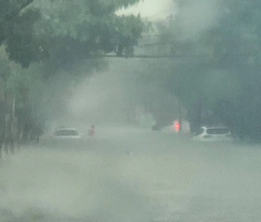 Mưa lớn chưa từng có khiến đường Trưng Nữ Vương chìm nghỉm trong nước, ô tô không còn lối thoát. Ảnh: HOÀI AN