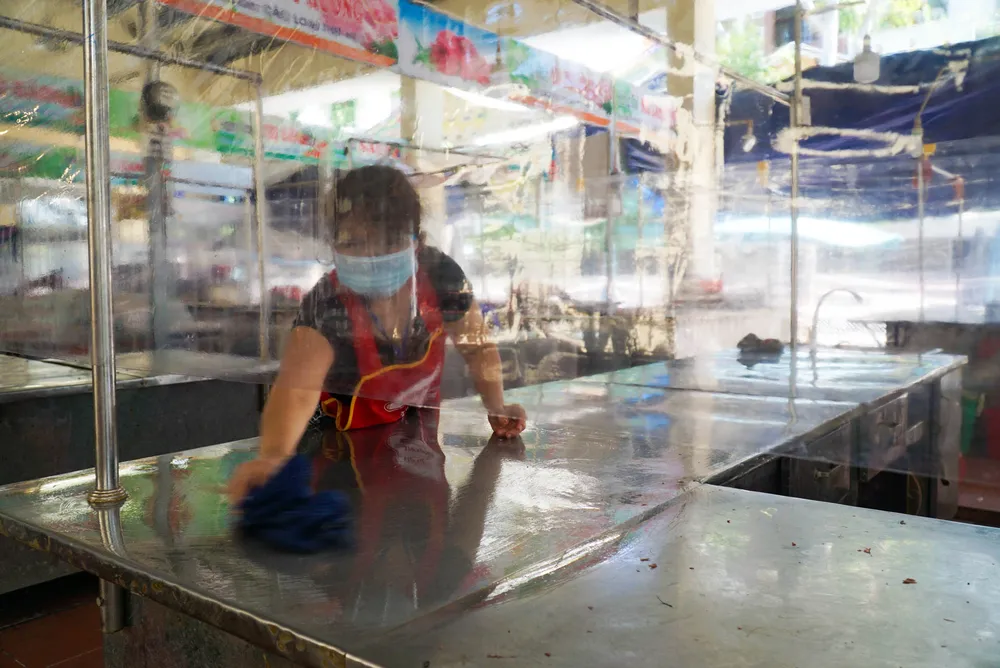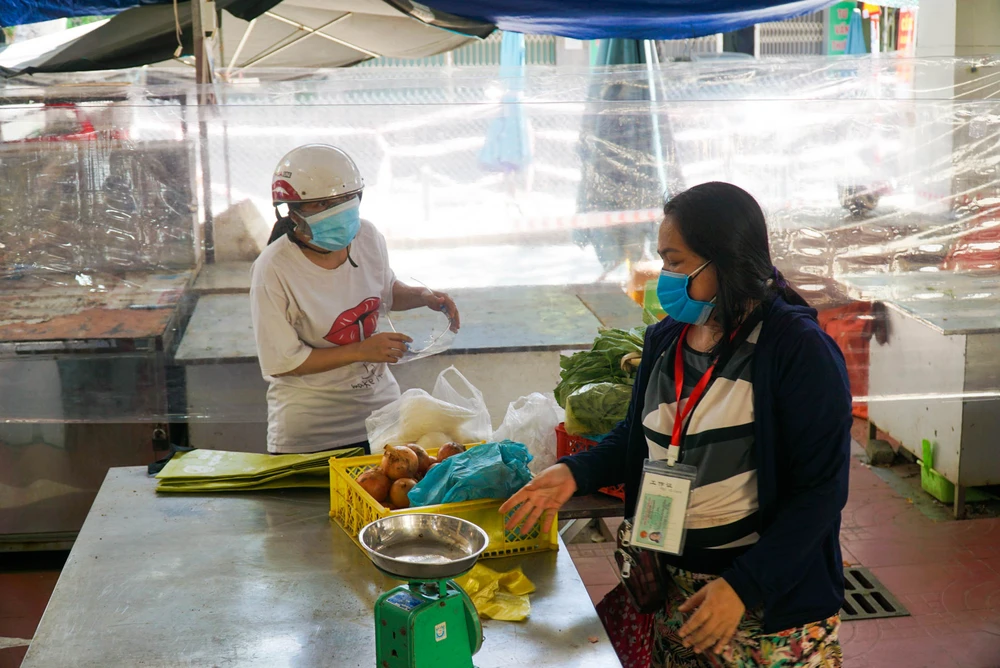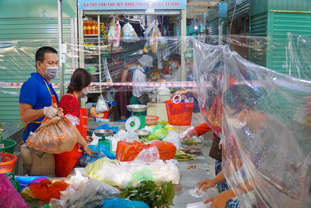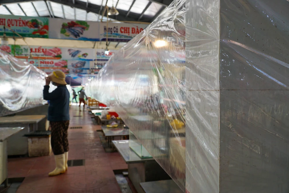 Phía bên trong, ban quản lý chợ đã lắp đặt tấm chắn chống giọt bắn, đồng thời duy trì 50% tiểu thương hoạt động. Mỗi tiểu thương phải đảm bảo đã tiêm ít nhất một mũi vaccine và xét nghiệm COVID-19 định kỳ 3 ngày/lần.