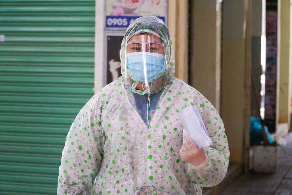 Đại diện ban điều hành tổ dân phố (TDP) được chính quyền địa phương phân chia khoảng thời gian đi chợ, mỗi người chỉ được vào chợ mua hàng trong 1 tiếng. Ảnh: BT