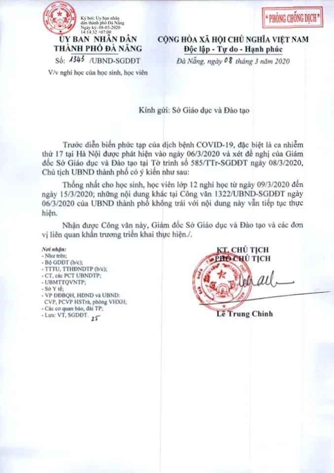 Chiều 8-3, ông Lê Trung Chinh, Phó Chủ tịch UBND TP Đà Nẵng, đã ký văn bản thông báo cho học sinh, học viên lớp 12 tại Đà Nẵng nghỉ học từ ngày 9-3 đến hết ngày 15-3 để phòng, chống dịch COVID-19.