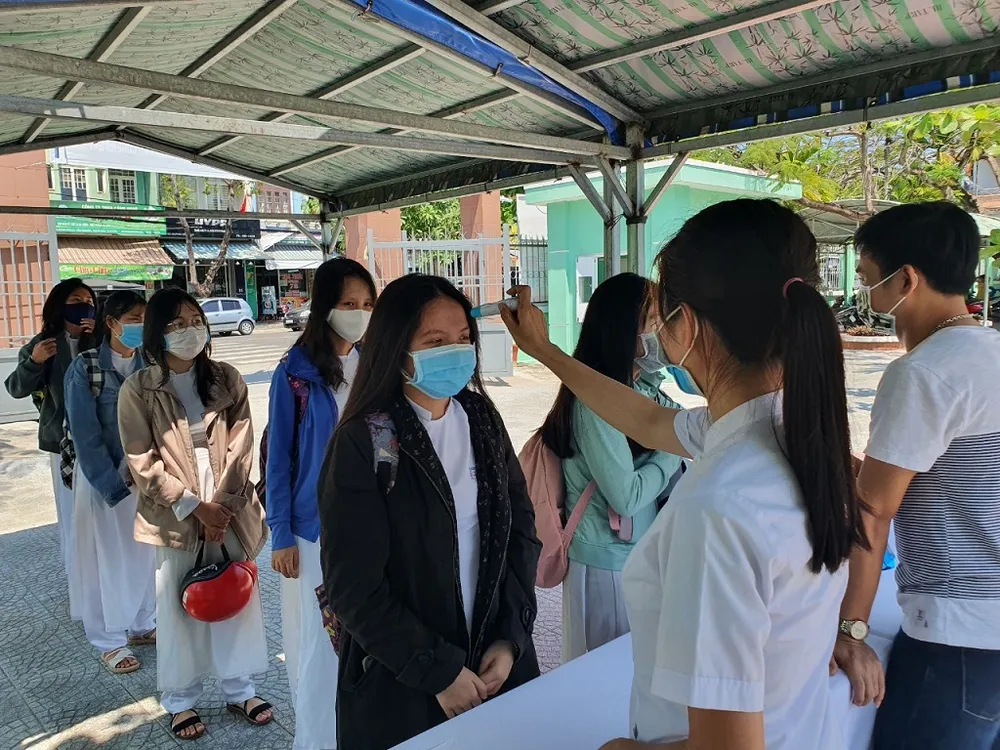 Học sinh Đà Nẵng được đo thân nhiệt trước khi vào trường. Ảnh: T.AN