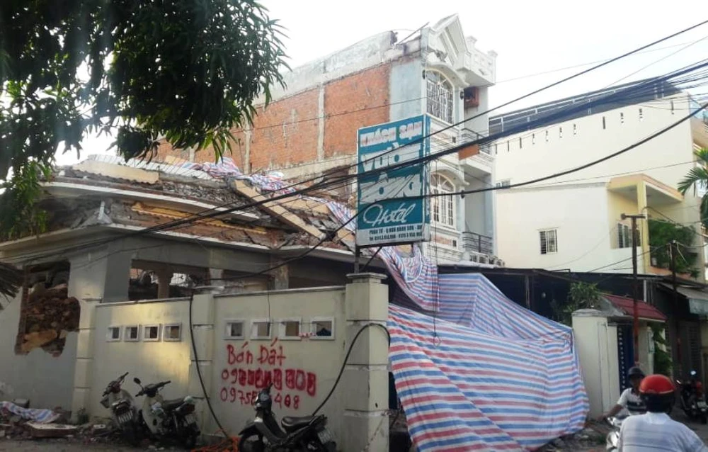 Công trình đang tháo dỡ bên cạnh nhà bà Liễu. Ảnh: HẢI HIẾU