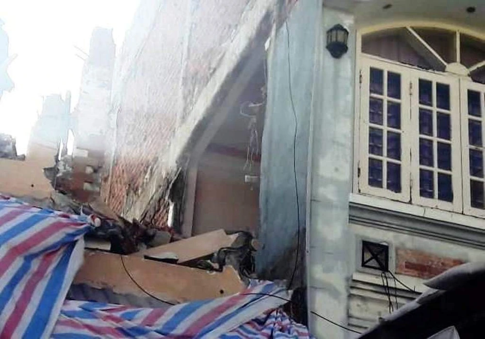 Liền sau đó, một trụ bê tông của công trình đang tháo dỡ cũng đâm về phía này khiến tủ gỗ để trong nhà ngã xuống đất. Bức tường đổ sập khoảng 12 m2.