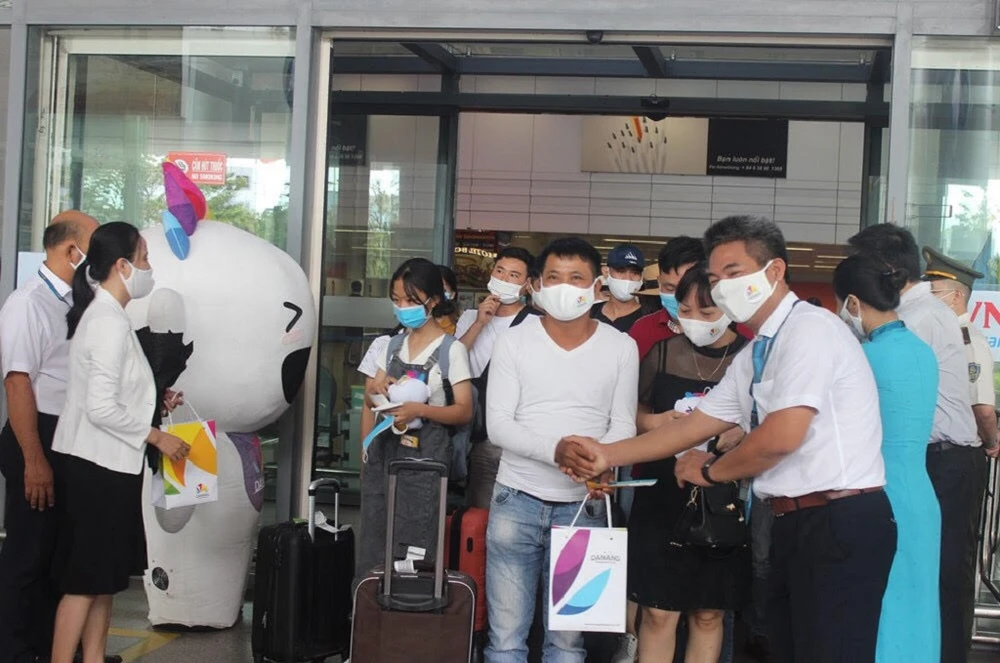Đại diện lãnh đạo Trung tâm Xúc tiến du lịch Đà Nẵng, Cảng Hàng không Quốc tế Đà Nẵng, Hãng hàng không Vietnam Airlines tại Miền Trung tham gia đón và tặng quà lưu niệm cho đoàn du khách.