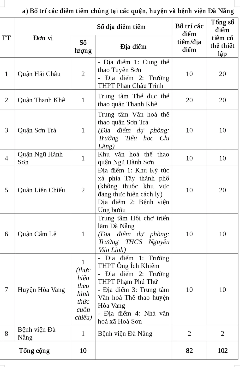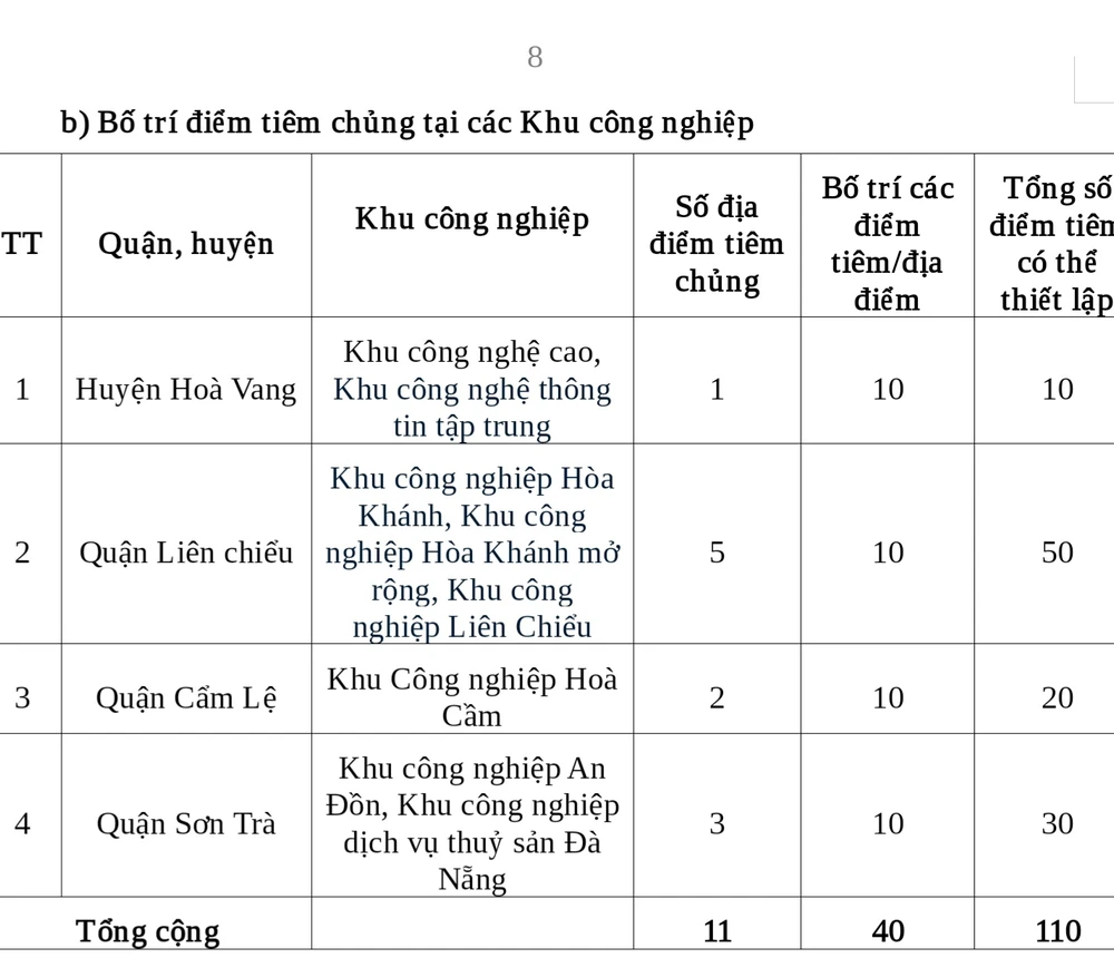 Để đạt tiến độ tiêm chủng nhanh nhất (20.000 người/ngày), Đà Nẵng dự kiến thiết lập từ 100 - 110 điểm tiêm chủng tại các quận, huyện và hai điểm tiêm chủng tại Bệnh viện Đà Nẵng để triển khai tiêm chủng cho các đối tượng do tuyến dưới chuyển tuyến (bảng dưới).