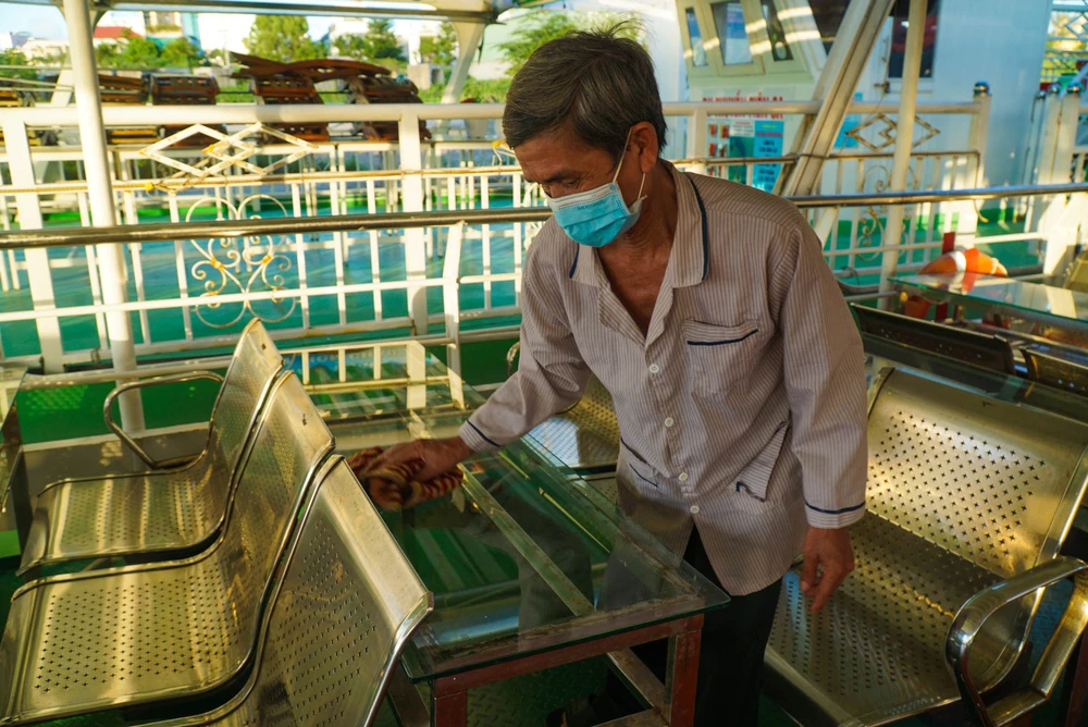 Khi TP Đà Nẵng cho phép mở cửa các điểm du lịch, ông Sót (lái du thuyền Hàn Giang) lau dọn, chờ ngày đón những vị khách đầu tiên. Ảnh: BT.