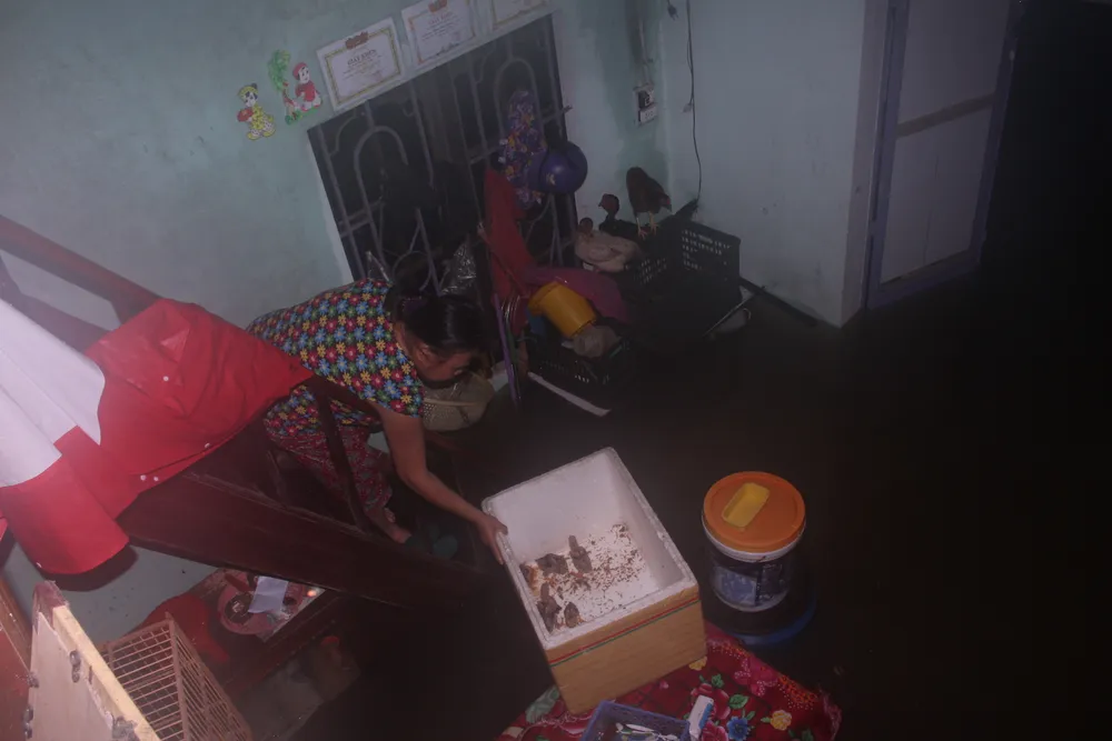 “Nước lên nhanh quá! Gia đình tôi chỉ kịp dọn đồ đạc lên gác, lúc quay ra thì hơn 20 chục con gà chết đuối gần hết rồi” - bà Phụng Thị Sinh (thôn Cẩm Toạn Trung, xã Hòa Phong) buồn rầu nói. Ảnh: TÂM AN