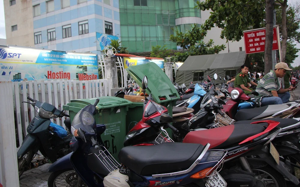 Hai thùng rác bị bãi giữ xe che chắn. Ảnh: Hải Hiếu