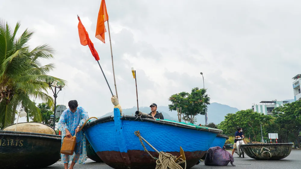 Tại bờ biển Thọ Quang (quận Sơn Trà), lực lượng biên phòng hỗ trợ ngư dân kéo thuyền thúng lên bờ tránh bão số 5.