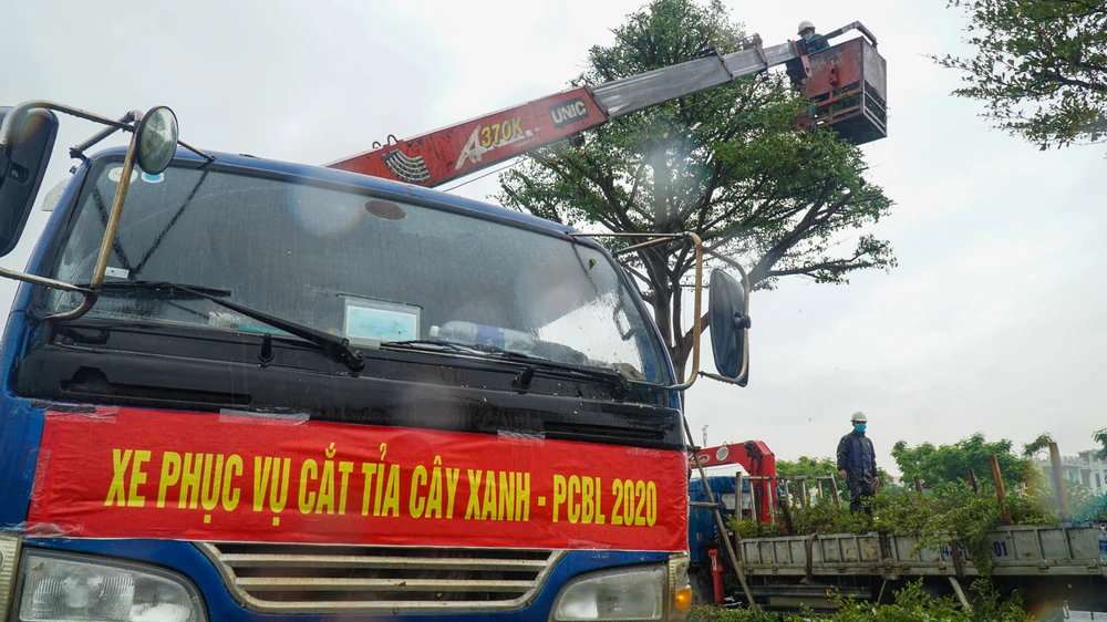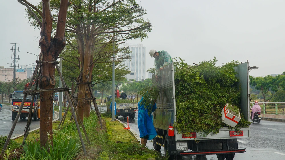 Tại các tuyến đường lớn ở gần cầu Trần Thị Lý, đường Trần Phú, Lê Duẩn,… nhiều nhân viên cùng xe chuyên dụng của Công ty Công viên cây xanh Đà Nẵng cũng khẩn trương cắt tỉa, thu dọn cây xanh để chống bão.