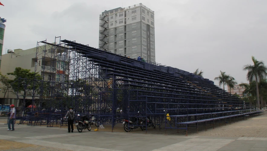 Ngày 25-3, Công ty cổ phần Đông Dương (TP.HCM) đang khẩn trương tiến hành lặp đặt hệ thống dàn giáo các khán đài phục vụ Cuộc thi trình diễn pháo hoa quốc tế Đà Nẵng 2015 (DIFC2015) với chủ đề “Đà Nẵng-Bản giao hưởng sắc màu” sẽ diễn ra vào hai ngày 28, 29-4-2015.