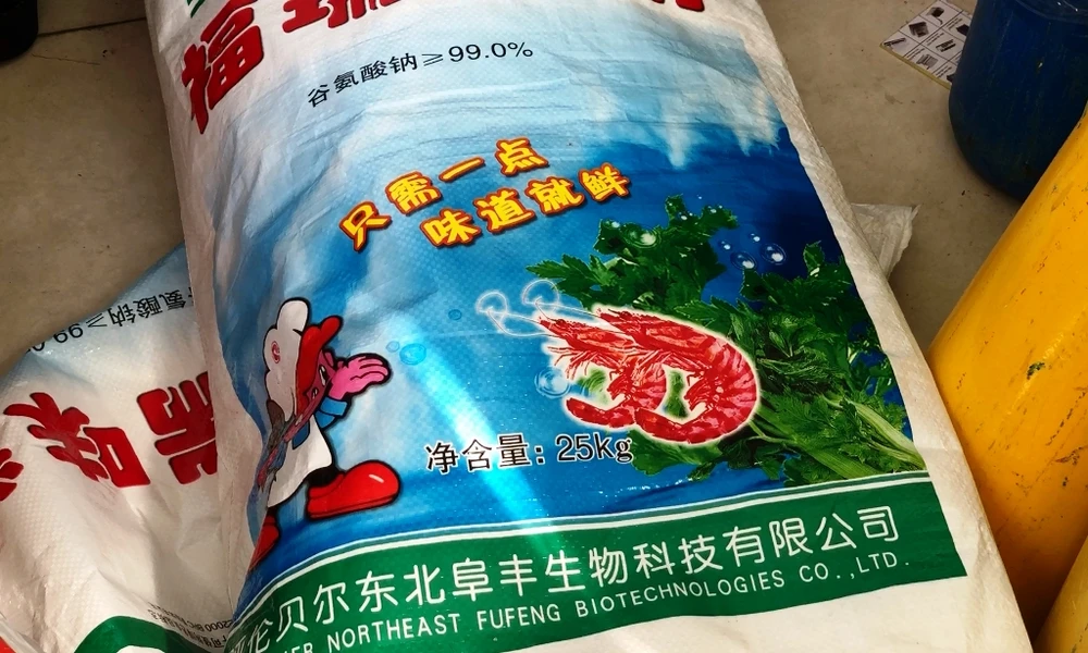 Bột ngọt nhãn hiệu Trung Quốc mà Nam dùng để chia nhỏ vào các bao bì nhãn hiệu A-One. Ảnh: HẢI HIẾU