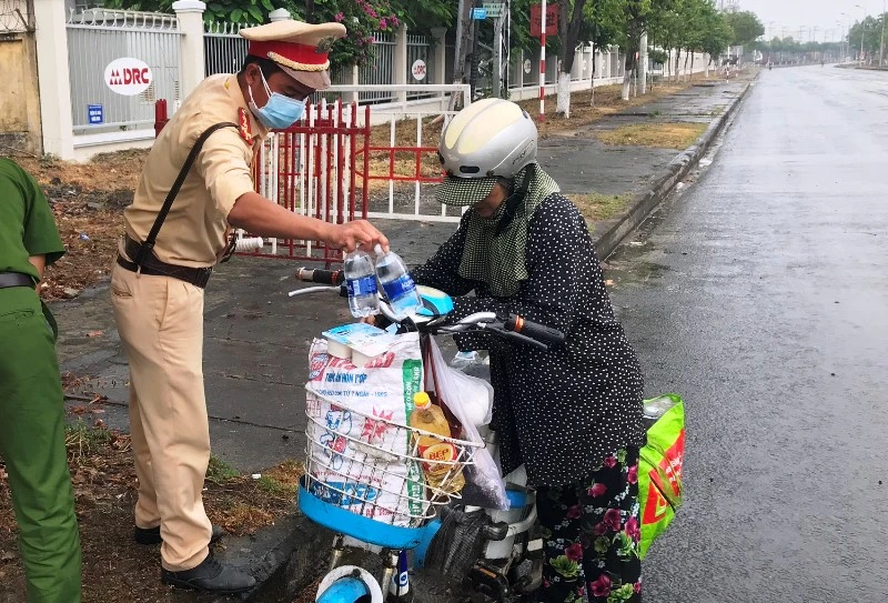 Một cụ bà nhặt ve chai được lực lượng chức năng tặng khẩu trang và nước uống. Ảnh: HẢI HIẾU