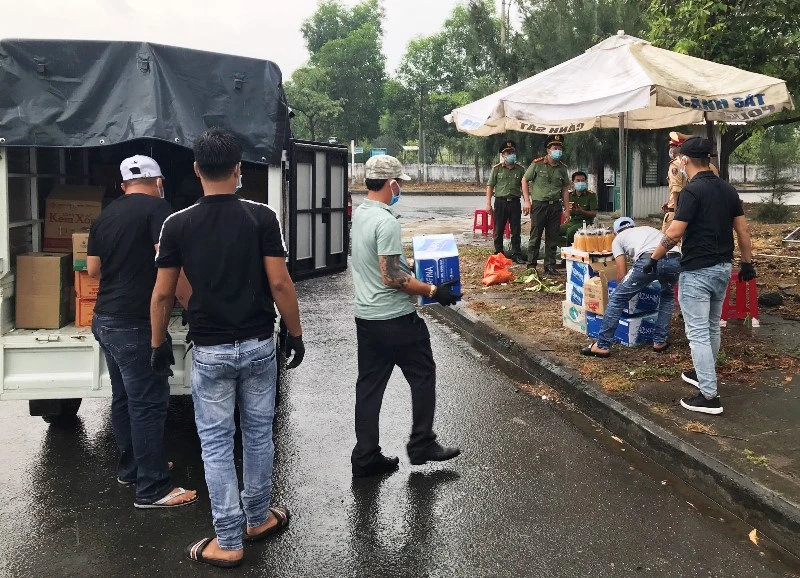 Người dân đến tặng thực phẩm, nước uống cho lực lượng đang làm nhiệm vụ. Ảnh: HẢI HIẾU
