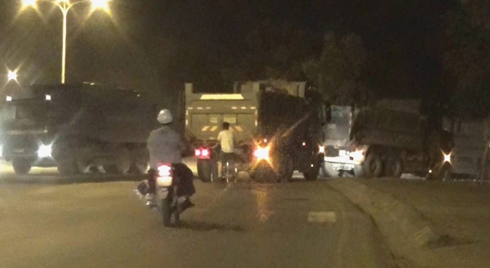 Hung thần xe ben nối đuôi nhau chạy trên quốc lộ 14B vào ban đêm. Ảnh: LÊ PHI