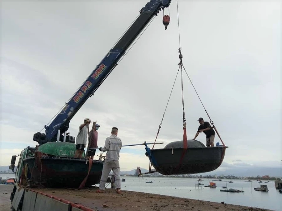 Người dân đưa thuyền lên bờ để tránh bão. Ảnh: TA