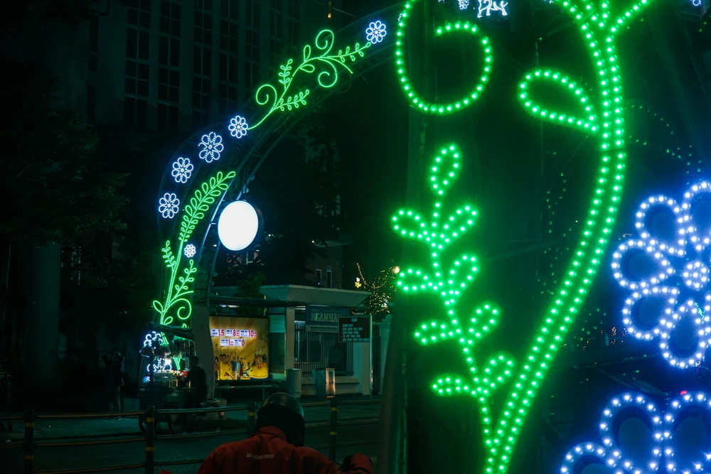 Các hàng cây được quấn đèn led màu trắng và màu vàng trung tính