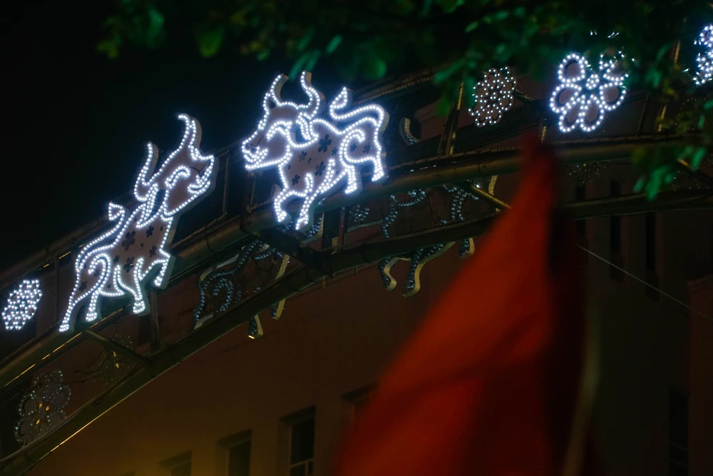 Khung hoa văn băng đường với những hình ảnh hoa mai, hoa đào chiếu sáng dọc tuyến đường Lê Duẩn