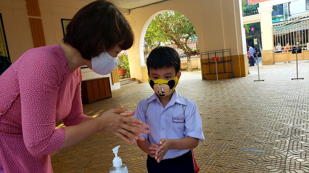 Giáo viên hướng dẫn các em học sinh rửa tay trước khi vào trường để phòng, chống dịch COVID-19. Ảnh: T.AN