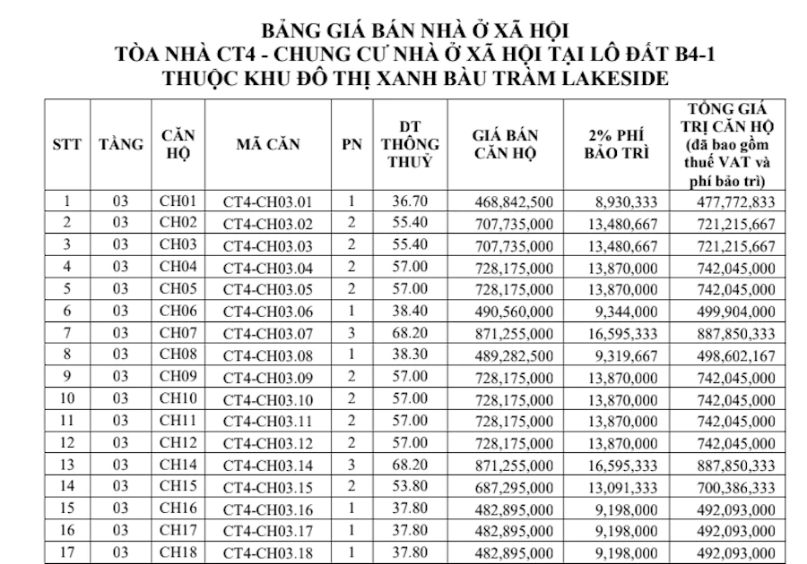 Bảng giá bán từng căn hộ Chung cư nhà ở xã hội đợt 2. Ảnh: LÊ PHI