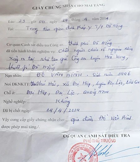 Trong giấy chứng nhận cho mai táng lập vào lúc 23 giờ ngày 14-4, Cơ quan CSĐT Công an TP Đà Nẵng ghi rõ là nghi can “chết chưa rõ nguyên nhân”.
