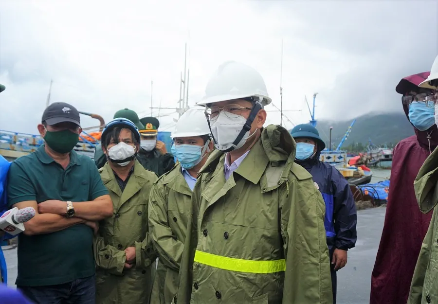 Bí thư Đà Nẵng Nguyễn Văn Quảng đi kiểm tra công tác phòng chống bão tại Âu thuyền và cảng cá Thọ Quang. Ảnh: TA