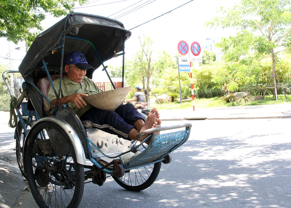 Bác xích lô cũng chùn chân trước nắng nóng kinh khủng đang diễn ra ở Đà Nẵng. Ảnh: N.TRI