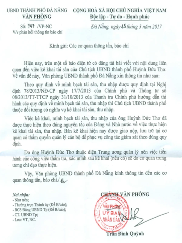 Sáng 15-3, ông Trần Đình Quỳnh, Chánh văn phòng UBND TP Đà Nẵng, đã ra thông báo phản hồi các thông tin báo chí liên quan đến vấn đề tài sản của ông Huỳnh Đức Thơ, Chủ tịch UBND TP Đà Nẵng.