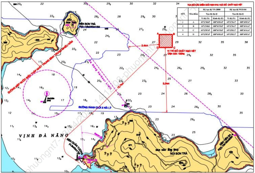 Sơ đồ vị trí dự tính nhận chìm vật chất trên biển Đà Nẵng.