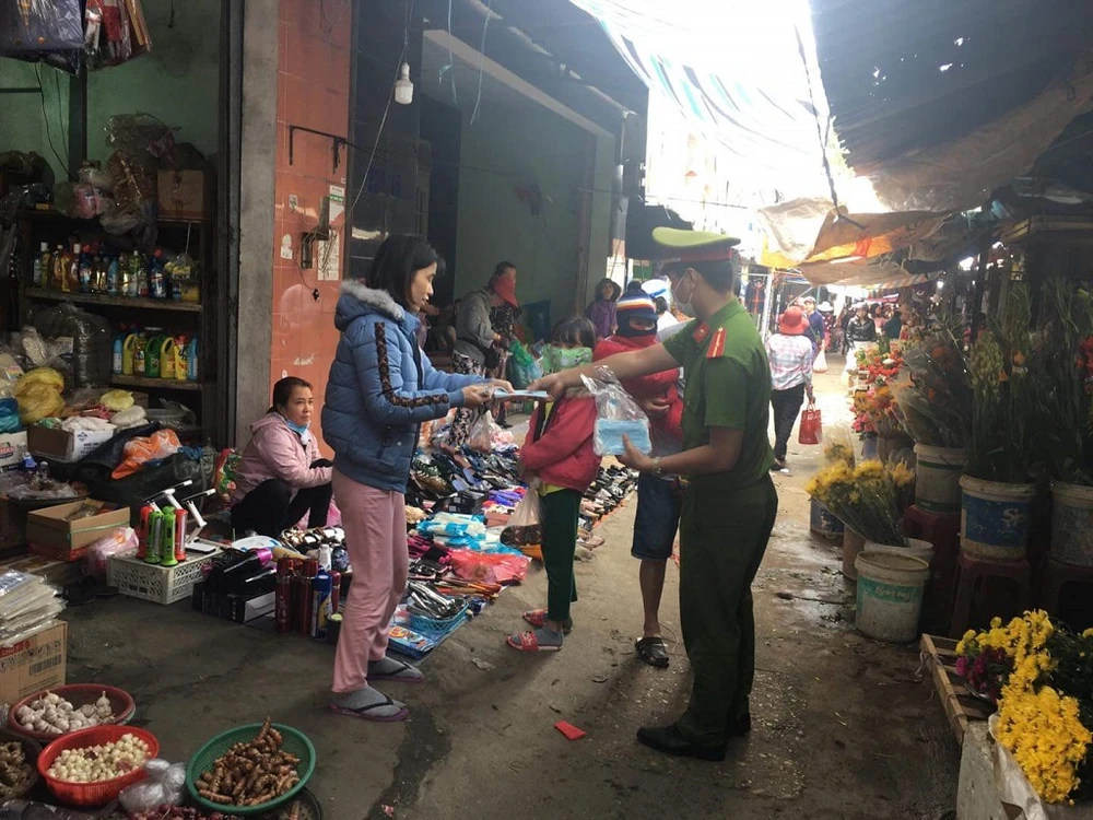 Lực lượng chức năng tiến hành phát khẩu trang miễn phí cho người dân tại những khu vực tập trung đông người để phòng, chống dịch. Ảnh: TT