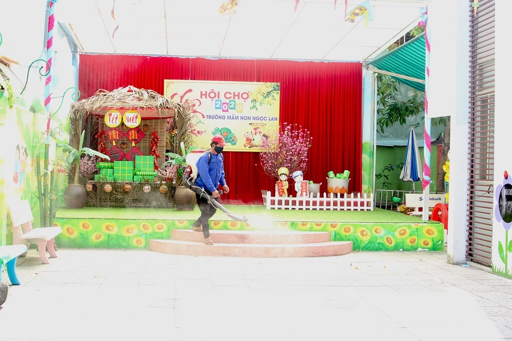 Lực lượng chức năng phun thuốc khử trùng tại một trường mầm non trên địa bàn quận Hải Châu, TP Đà Nẵng. Ảnh: TT