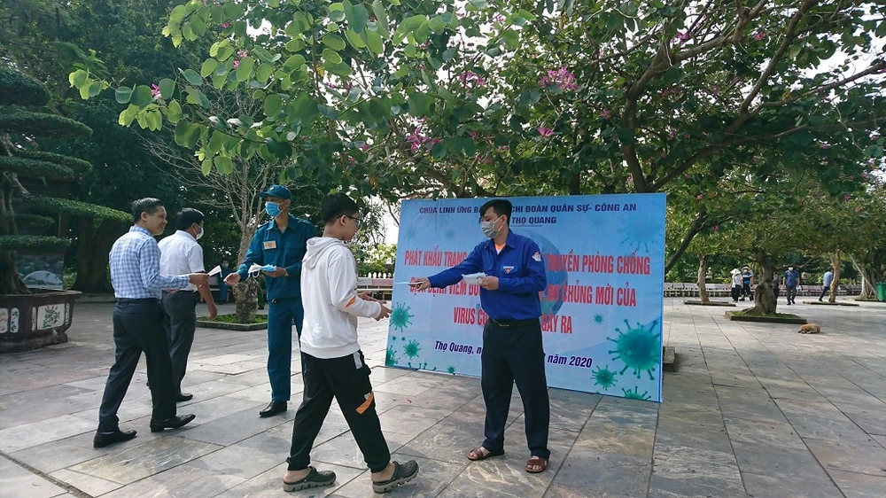Phát khẩu trang miễn phí cho người dân và du khách trên chùa Linh Ứng: Ảnh: TT