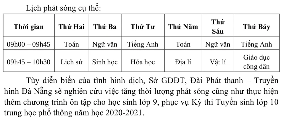 Sở GD&ĐT Đà Nẵng cho biết tùy diễn biến dịch bệnh, Sở và các đơn vị sẽ phối hợp nghiên cứu tăng thời lượng phát sóng cũng như có thêm chương trình ôn tập cho học sinh khối lớp 9 để phục vụ cho kỳ thi tuyển sinh lớp 10.