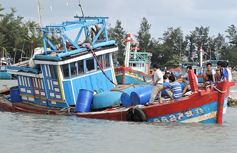 Một tàu cá tại Lý Sơn hư hại sau bão. Ảnh: PHẠM MỊNH