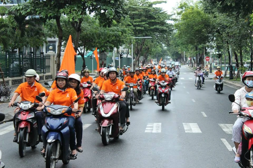 Người dân Đà Nẵng trong áomàu cam- màu biểu tượng của chiến dịch phòng chống bạo lực đối với phụ nữ và trẻ em gái mít tinh kêu gọi xóa bỏ bạo lực với phụ nữ và trẻ em gái. Ảnh: Ngọc Bảo