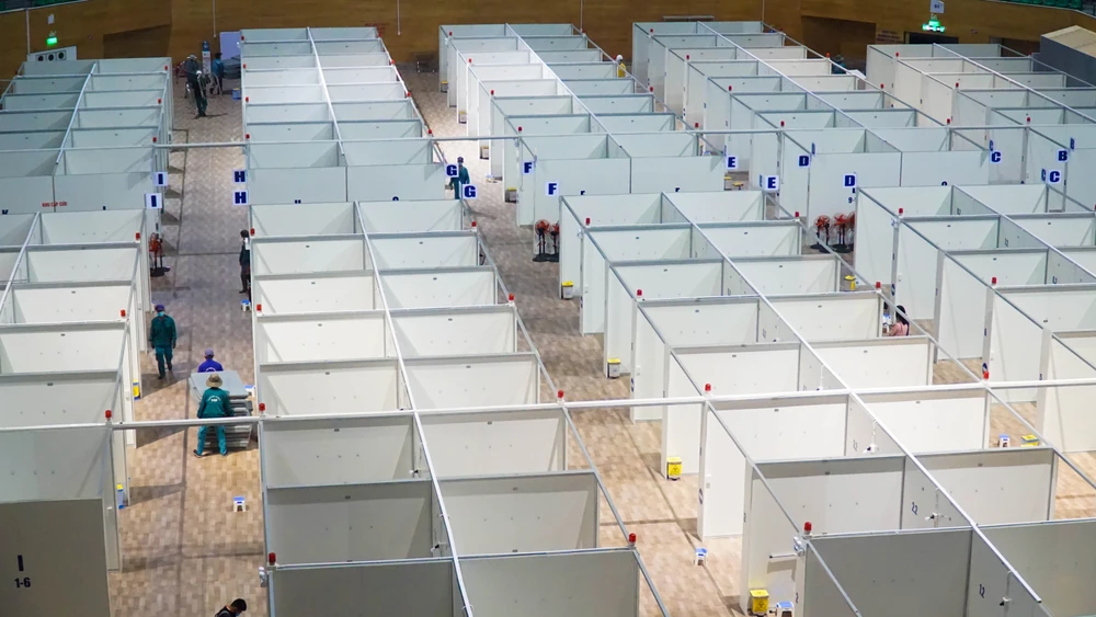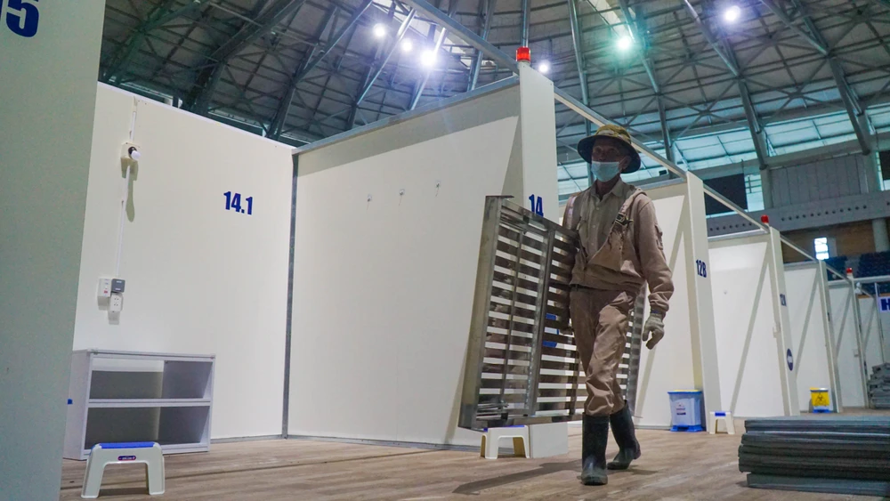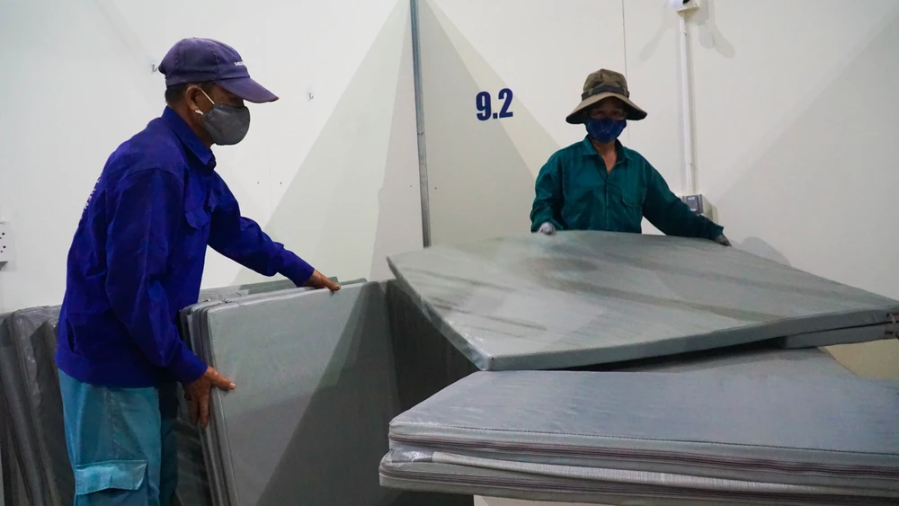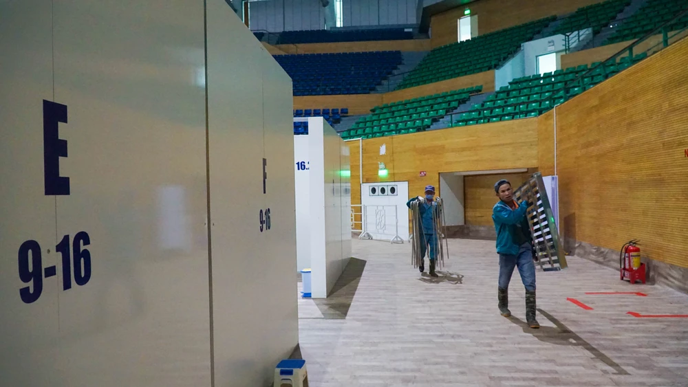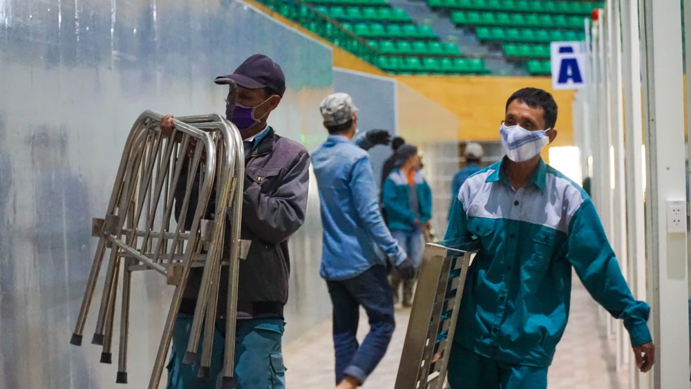 Các công nhân của Sun Group thực hiện tháo dỡ tại bệnh viện dã chiến Tiên Sơn, TP Đà Nẵng.