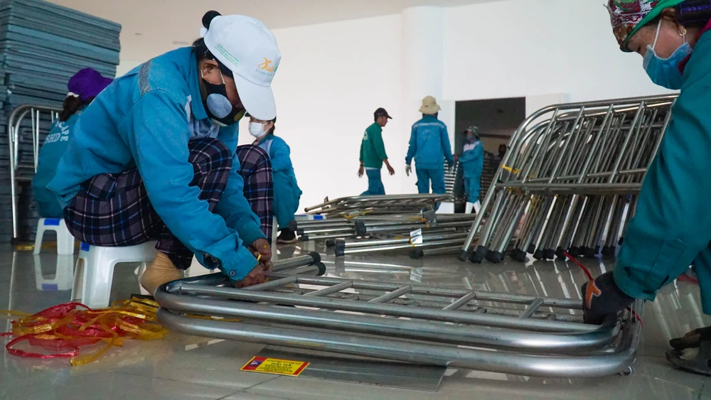 Các công nhân đang tiến hành phân loại các thiết bị, vật dụng được tháo dỡ trong bệnh viện, nhằm tạo thuận lợi cho việc vận chuyển.