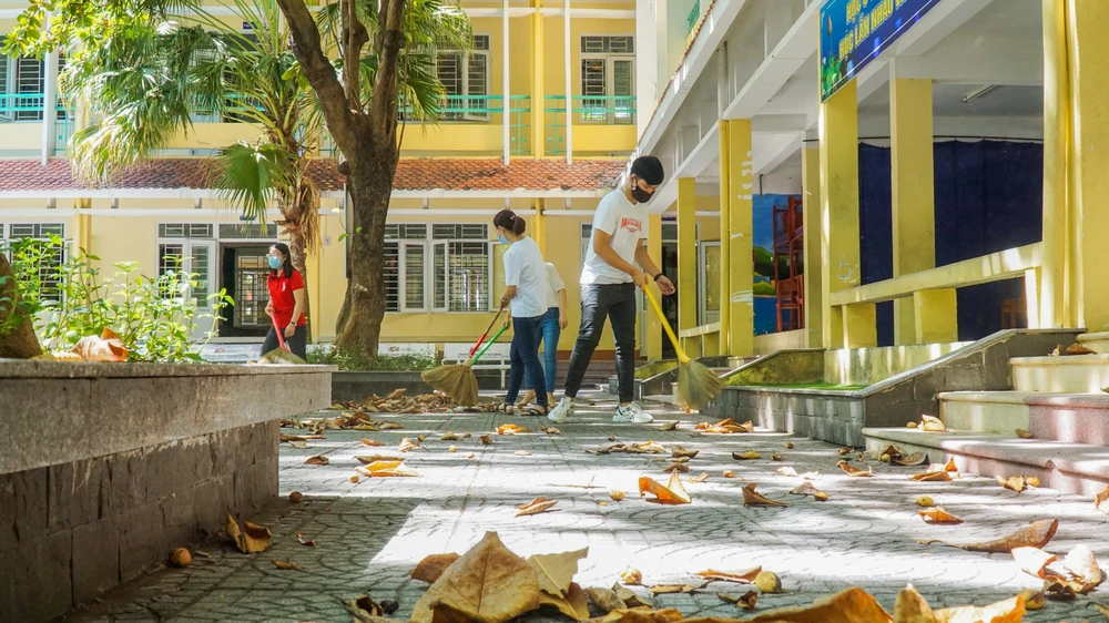 Sáng 13-9, trường THCS Kim Đồng (quận Hải Châu), các giáo viên tổ chức dọn dẹp vệ sinh, khử khuẩn trường lớp để chuẩn bị đón học sinh quay trở lại trường vào đầu tuần sau.