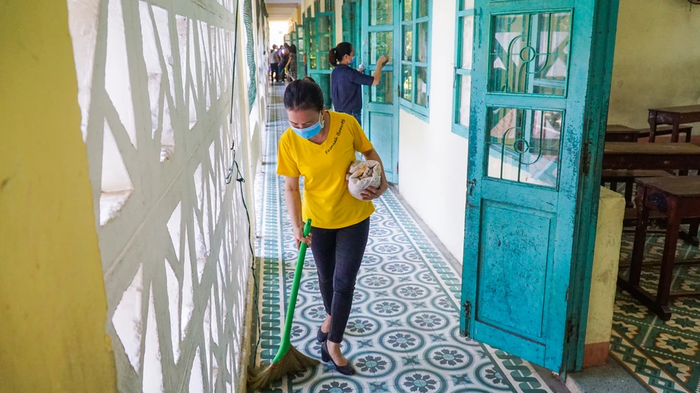 Từ sáng sớm, các thầy cô đã có mặt tại trường để lau chùi, làm sạch bề mặt sàn lớp học, bàn ghế cho đến những vật dụng liên quan đến nhà vệ sinh, khu công cộng quanh trường.