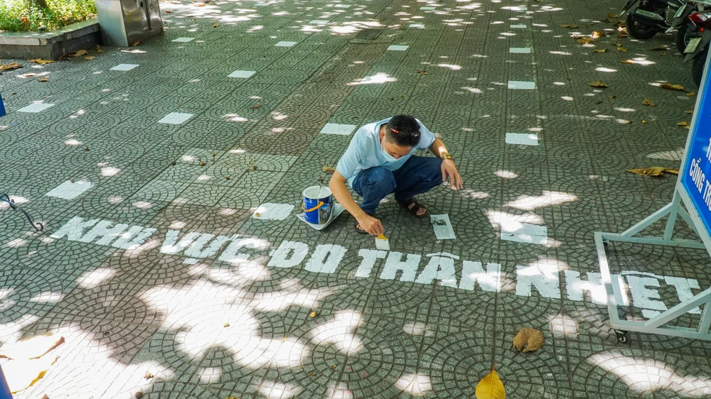 Ở phía cổng trường, các giáo viên kẻ vạch giãn cách để các em có thể xếp hàng đo thân nhiệt. Chăm chú tô sơn trên sân, thầy Nguyễn Xuân Thủy cảm thấy vui vì sắp được gặp lại các em học sinh. “Sáng nay trời khá oi bức, nhưng tâm trạng ai cũng hào hứng khi thực hiện công việc tổng vệ sinh tại trường”, thầy Thủy nói.