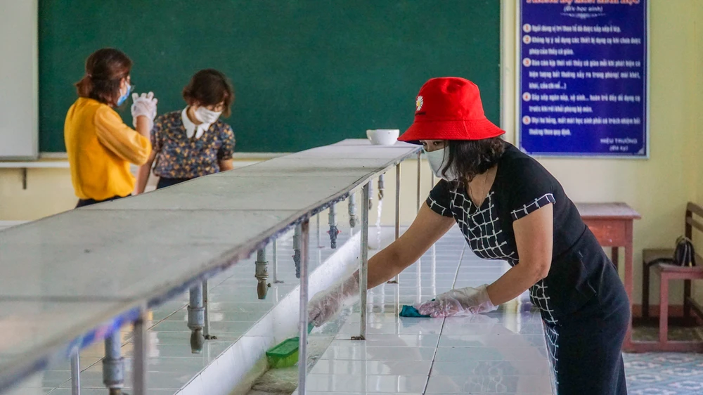 “Học sinh nghỉ học lâu khiến phòng học, bàn ghế bụi bẩn nên cần lau chùi thật kỹ. Trường lớp sạch sẽ, có đầy đủ nước rửa tay sát khuẩn sẽ tạo ra tâm lý an tâm hơn cho học sinh khi các em quay trở lại trường vào thời điểm dịch bệnh chưa thực sự lui”, cô Nguyễn Bích Lê (giáo viên trường THCS Kim Đồng) nói.