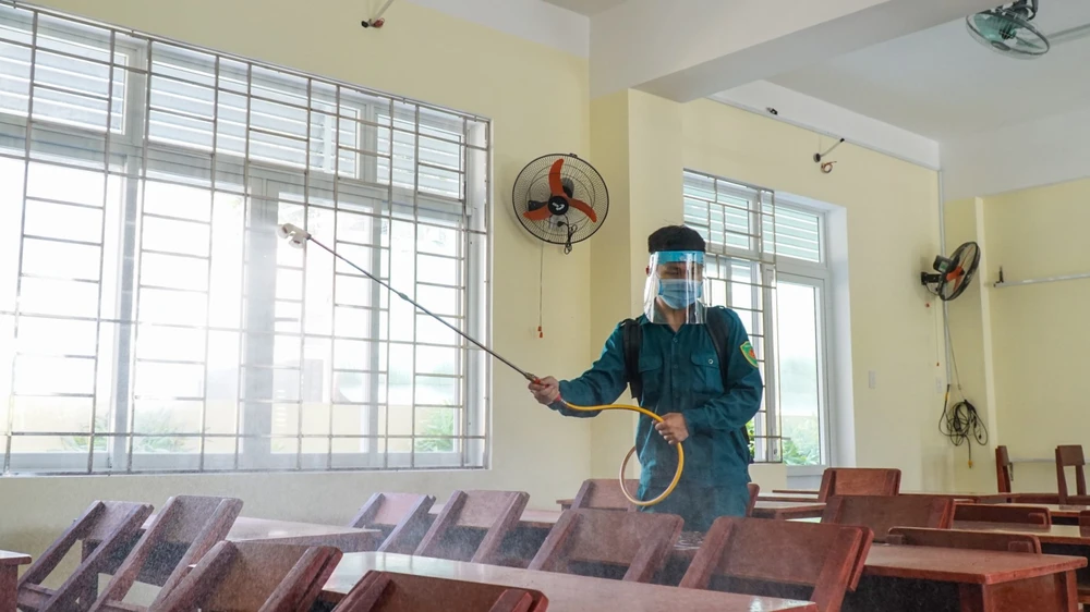 Trước đó, UBND TP Đà Nẵng đã ban hành công văn cho phép các trường THPT, THCS, trung tâm giáo dục thường xuyên bắt đầu mở cửa đón học sinh đi học lại từ ngày 14-9. Được biết, những ngày vừa qua, nhiều trường học trên địa bàn TP đã tiến hành dọn dẹp vệ sinh, khử khuẩn lớp học. Trong ảnh: Trường THCS Nguyễn Huệ tiến hành phun khử khuẩn lớp học.