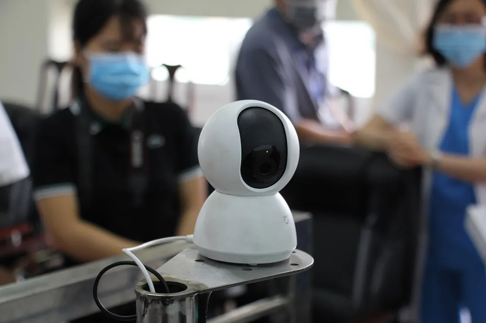 Nhân viên y tế giao tiếp từ xa với bệnh nhân qua camera. Ảnh: HĐ