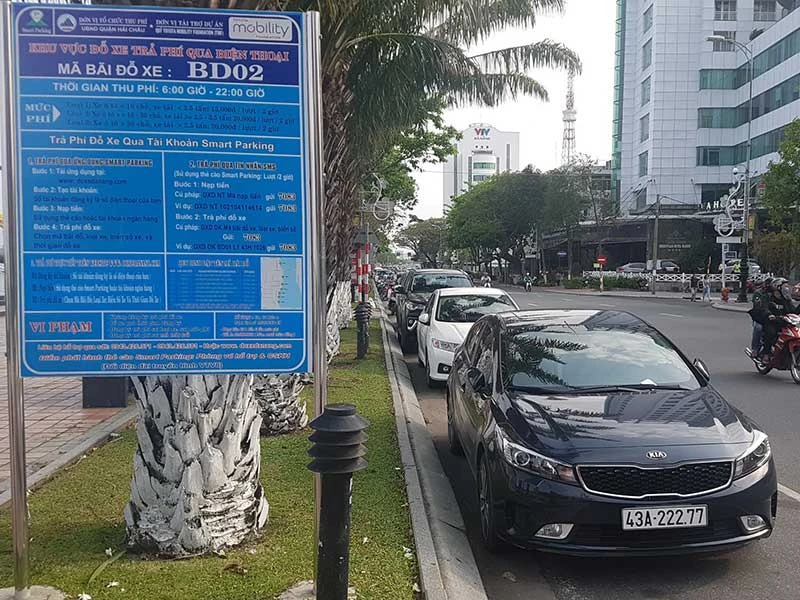 Để tổ chức thu phí đậu đỗ lòng đường Bạch Đằng, quận Hải Châu đang triển khai một kiốt cố định và hai kiốt lưu động để tuyên truyền, hướng dẫn tài xế cài đặt ứng dụng Smart Parking trên điện thoại, mua thẻ cào nộp tiền. Mệnh giá thẻ cào quy định từ 15.000 đến 120.000 đồng.