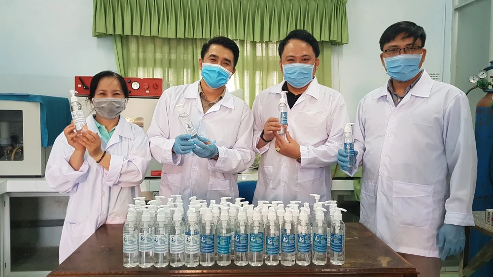 Nhóm cán bộ và sinh viên ĐH Sư phạm Đà Nẵng chế tạo dung dịch rửa tay phòng chống dịch Corona. Ảnh: NTCC