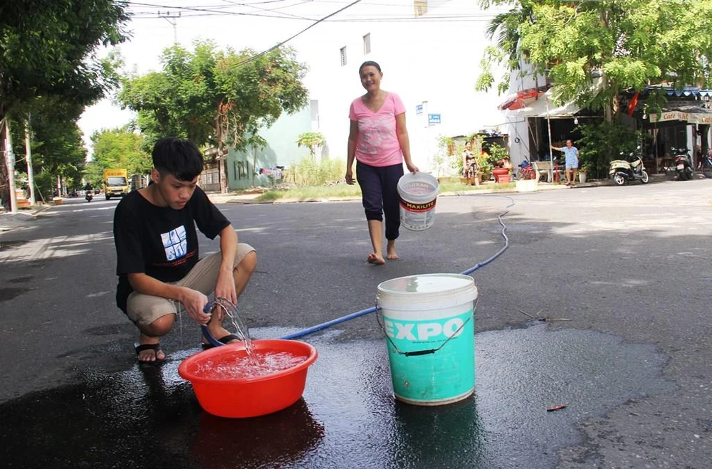 Người dân quận Sơn Trà đang lấy nước từ giếng bơm lên để dùng tạm. Ảnh: HẢI HIẾU