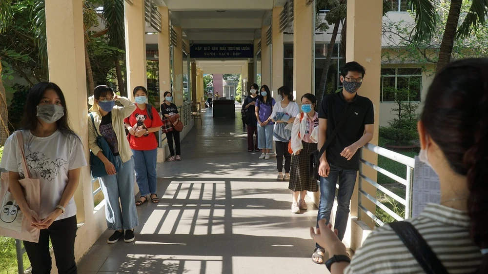 Các thí sinh mang khẩu trang và xếp hàng đảm bảo giãn cách. Ảnh: BÙI TOÀN